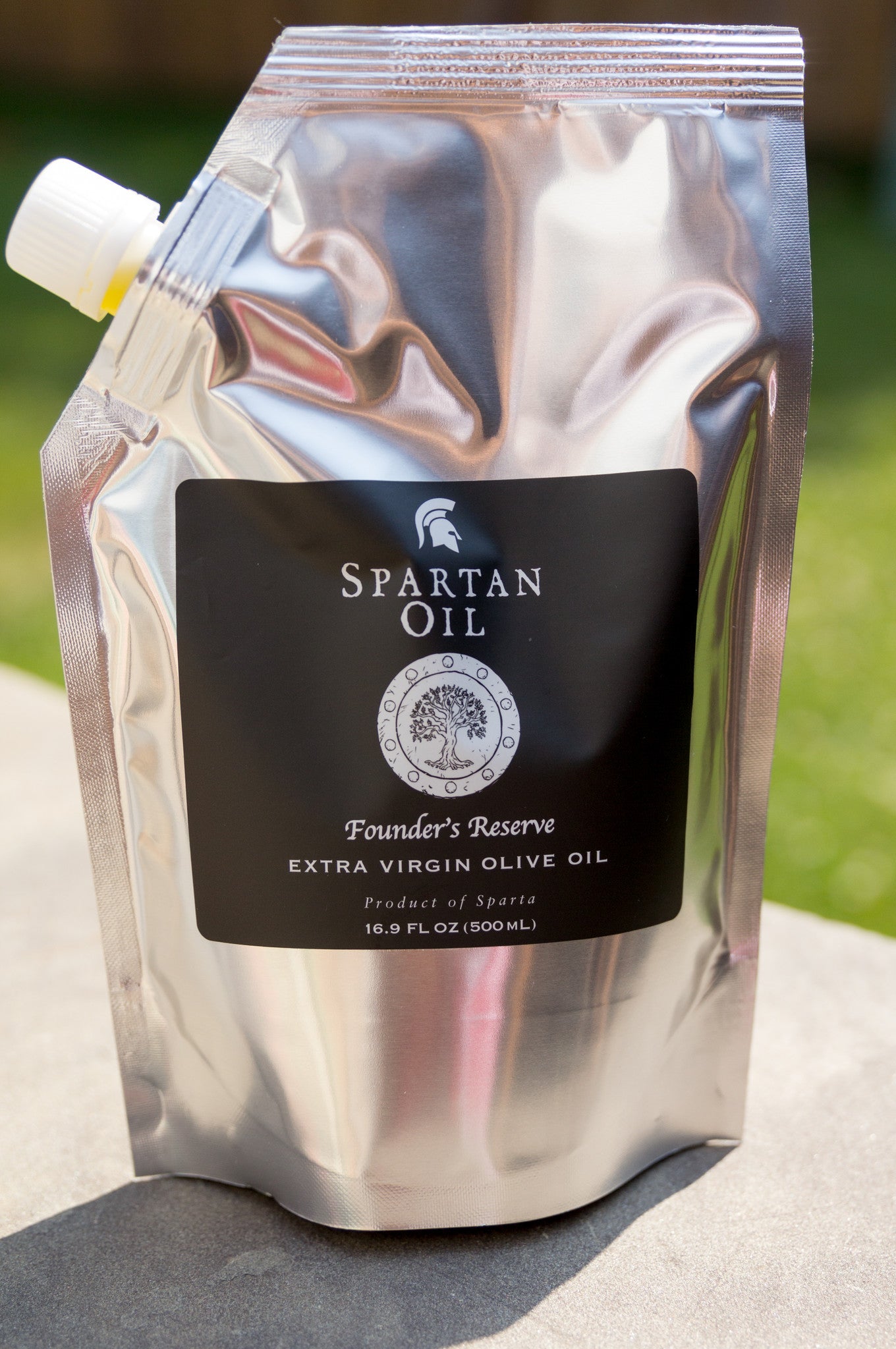 Spartan Oil in a refill pouch. One pouch will fill up a 500ml bottle. Keep your premium bottle and refill it with our eco-friendly pouch! Now available with Spartan Oil Founder's Reserve!